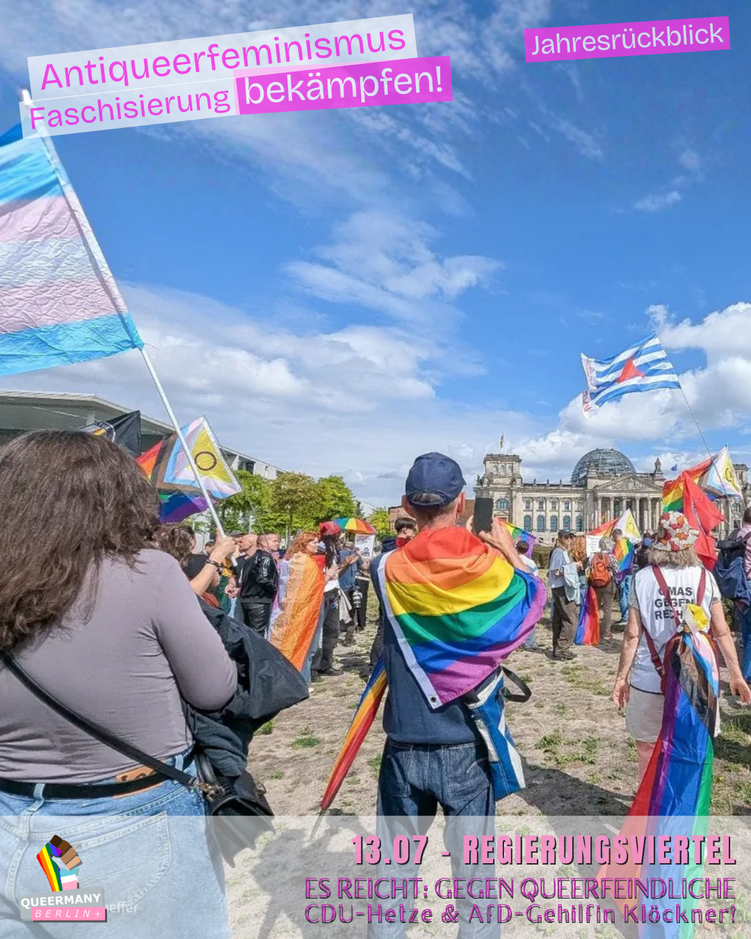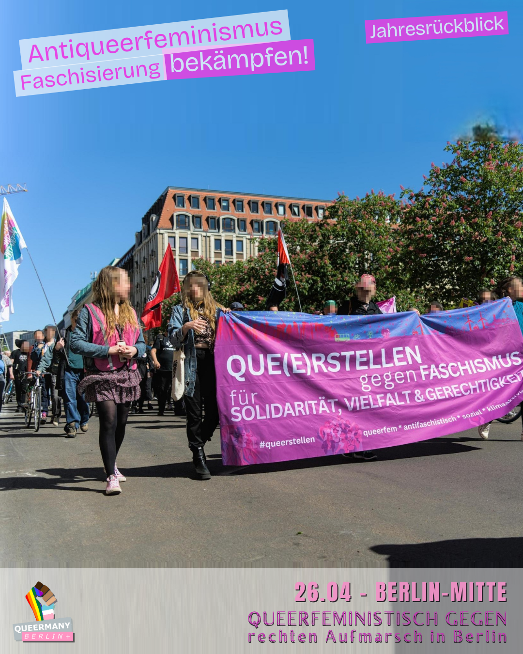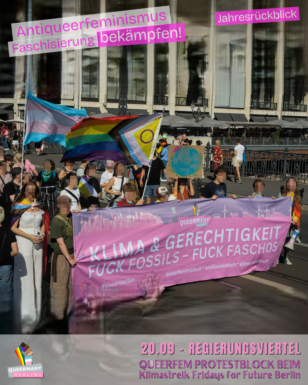 Queermany Berlin ist Teil einer queerfeministischen, antifaschistischen und neurodiversitätsfreundlichen Bewegung, die aus der Klimagerechtigkeitsbewegung hervorgegangen ist und sich für soziale Gerechtigkeit sowie die vielfältigen Lebensrealitäten der Menschen in Berlin einsetzt. Im Vorfeld der Senatswahl 2026 führen wir eine Kampagne gegen die Verdrängung von FLINTA* und queeren Menschen und kämpfen für Stadtgerechtigkeit, strukturelle Sicherheit und gleichberechtigte Teilhabe in ganz Berlin – einschließlich der Außenbezirke.