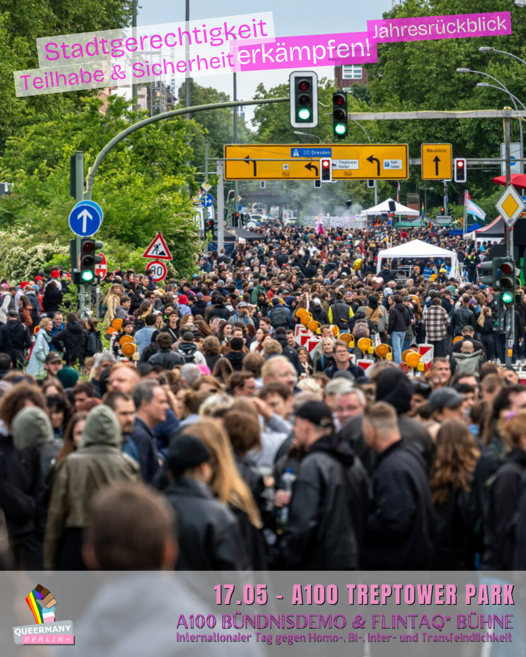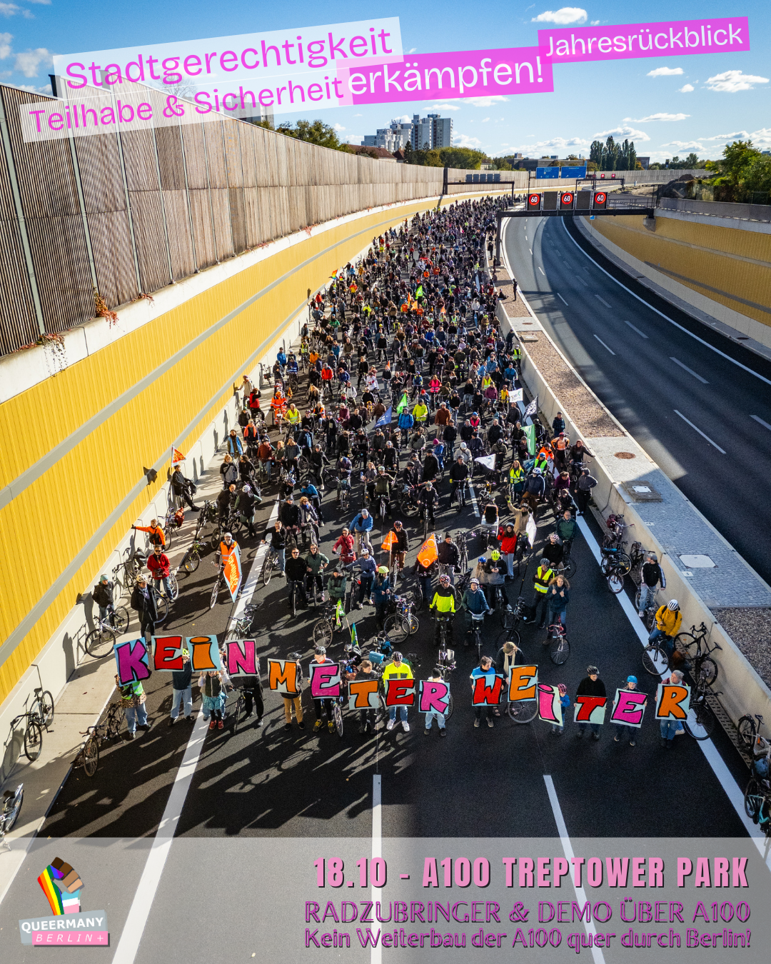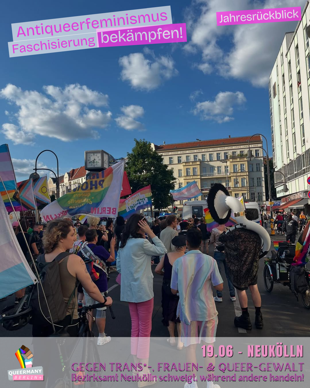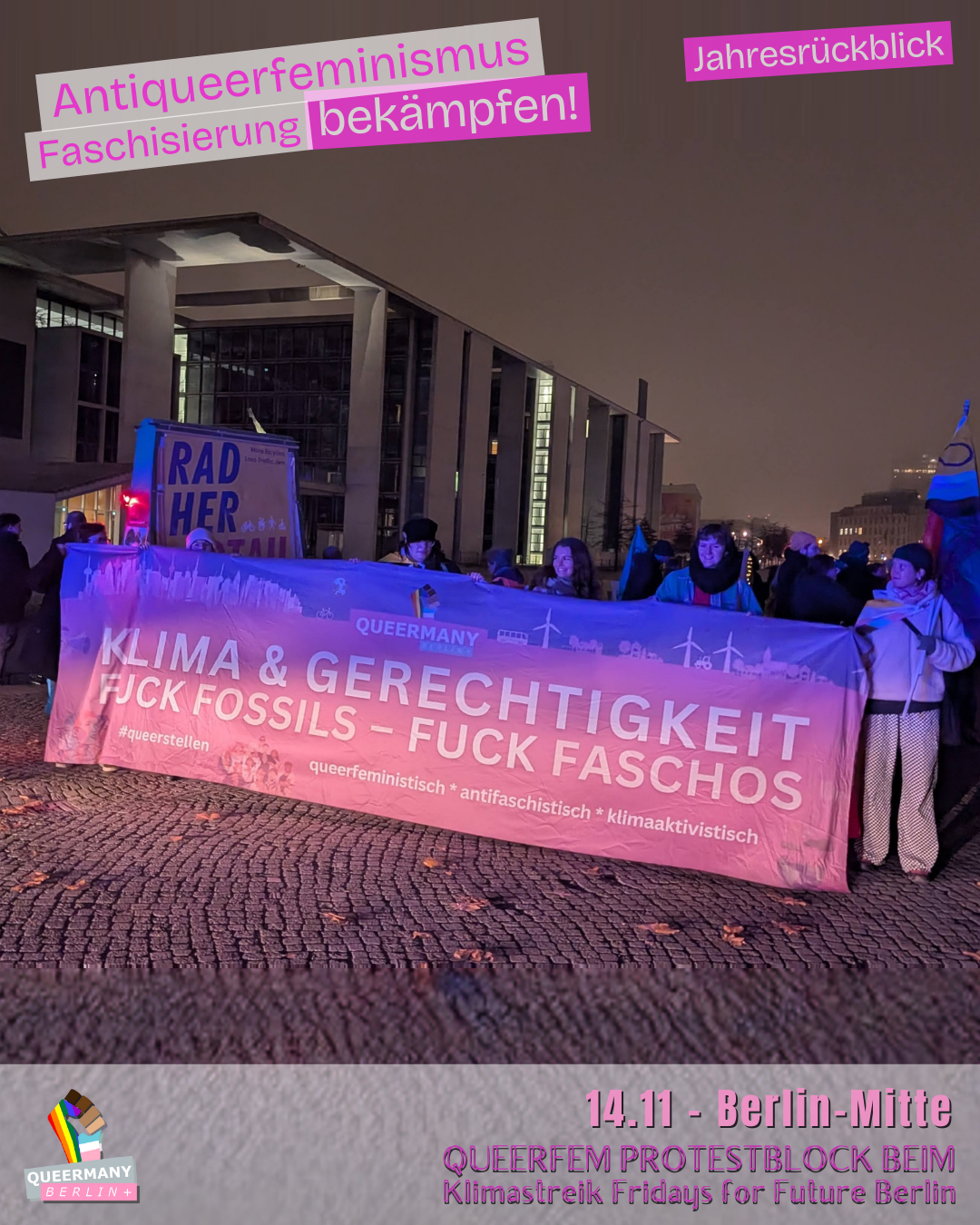 Queermany Berlin ist Teil einer queerfeministischen, antifaschistischen und neurodiversitätsfreundlichen Bewegung, die aus der Klimagerechtigkeitsbewegung hervorgegangen ist und sich für soziale Gerechtigkeit sowie die vielfältigen Lebensrealitäten der Menschen in Berlin einsetzt. Im Vorfeld der Senatswahl 2026 führen wir eine Kampagne gegen die Verdrängung von FLINTA* und queeren Menschen und kämpfen für Stadtgerechtigkeit, strukturelle Sicherheit und gleichberechtigte Teilhabe in ganz Berlin – einschließlich der Außenbezirke.